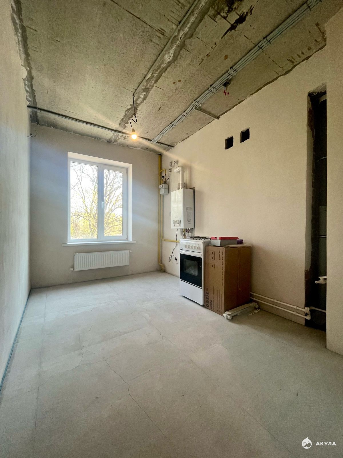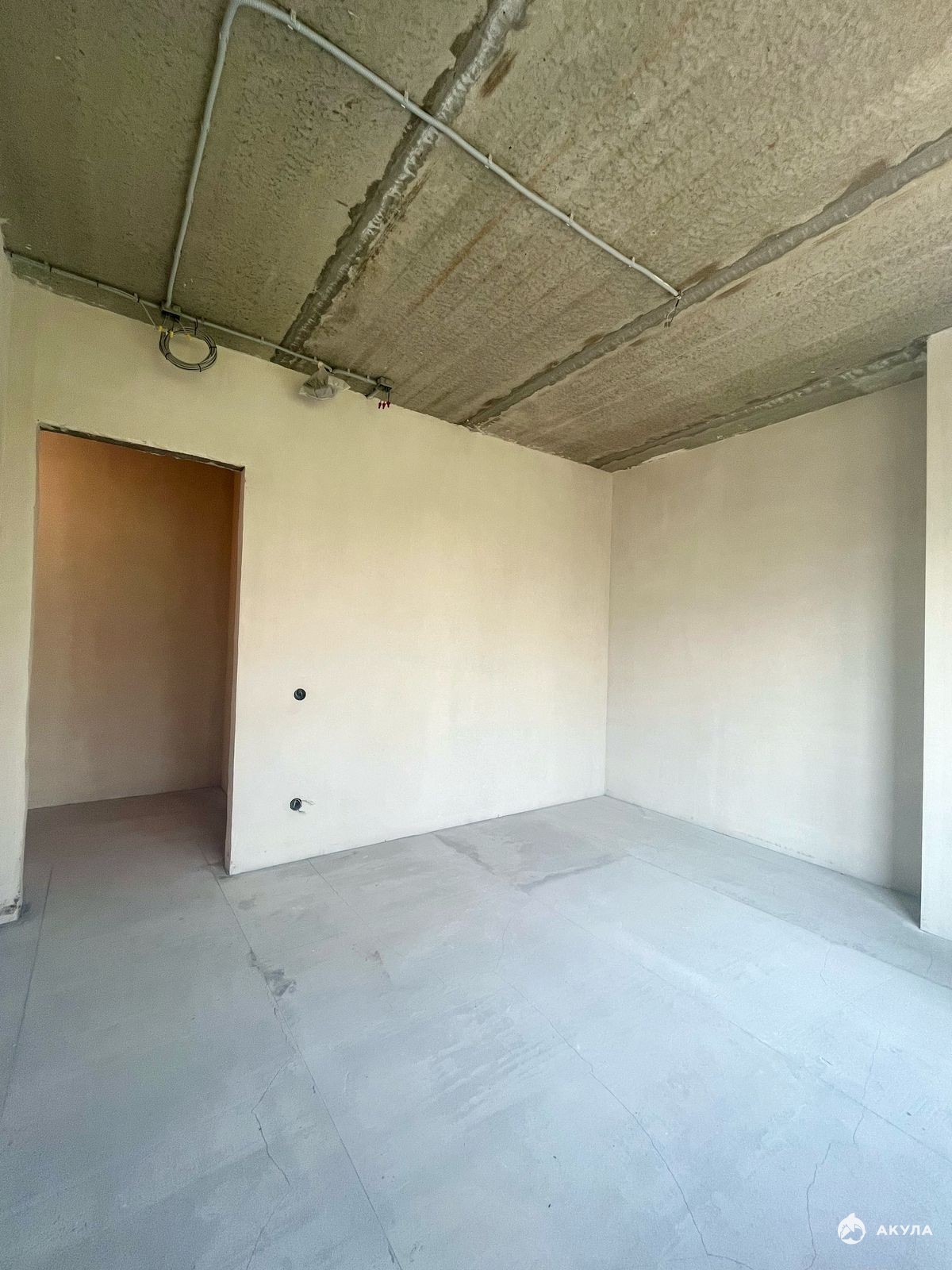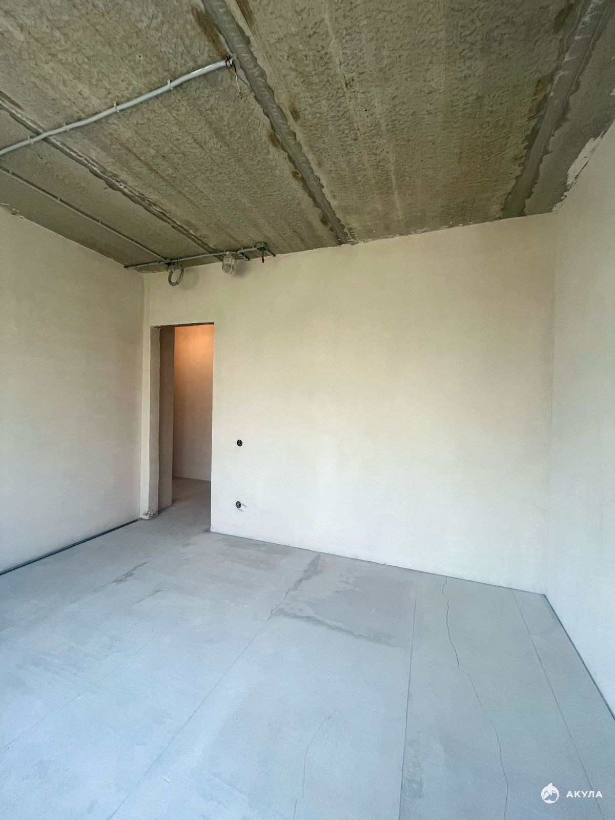 Стены отштукатурены под обои, углы ровные. Пол подготовлен под ламинат.