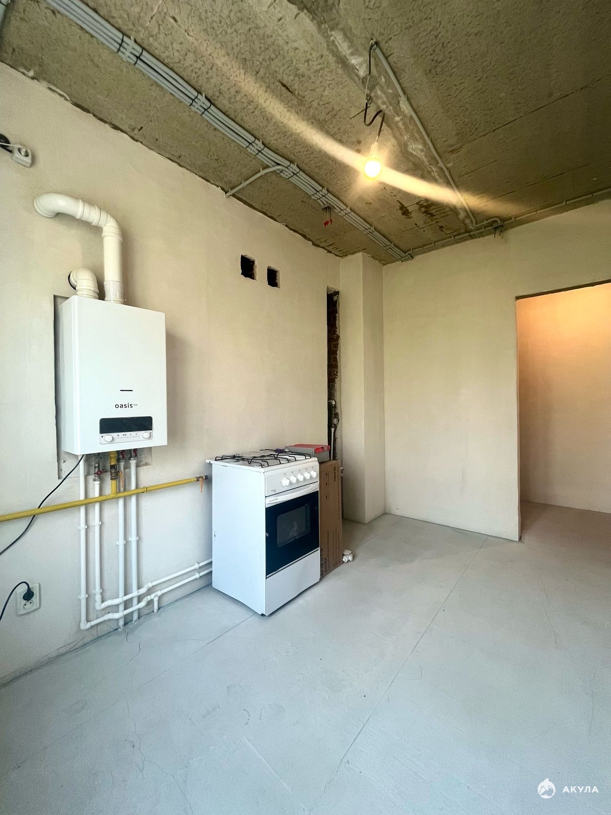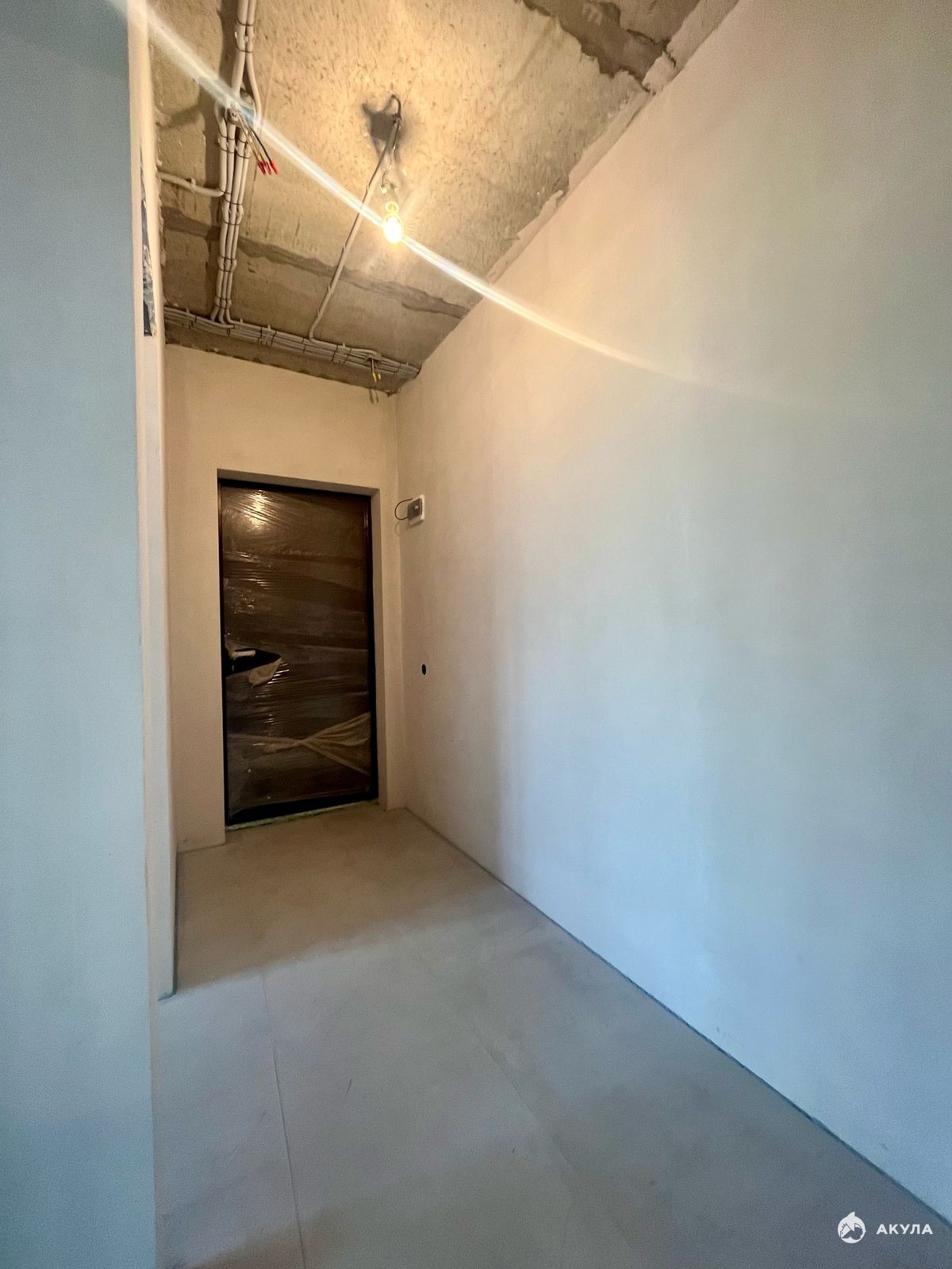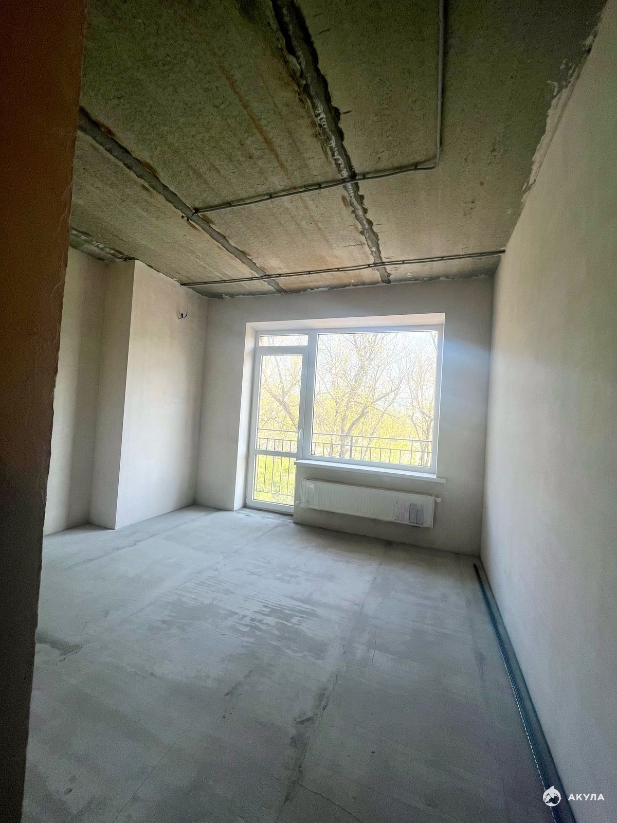 Стены отштукатурены под обои, углы ровные. Пол подготовлен под ламинат.
